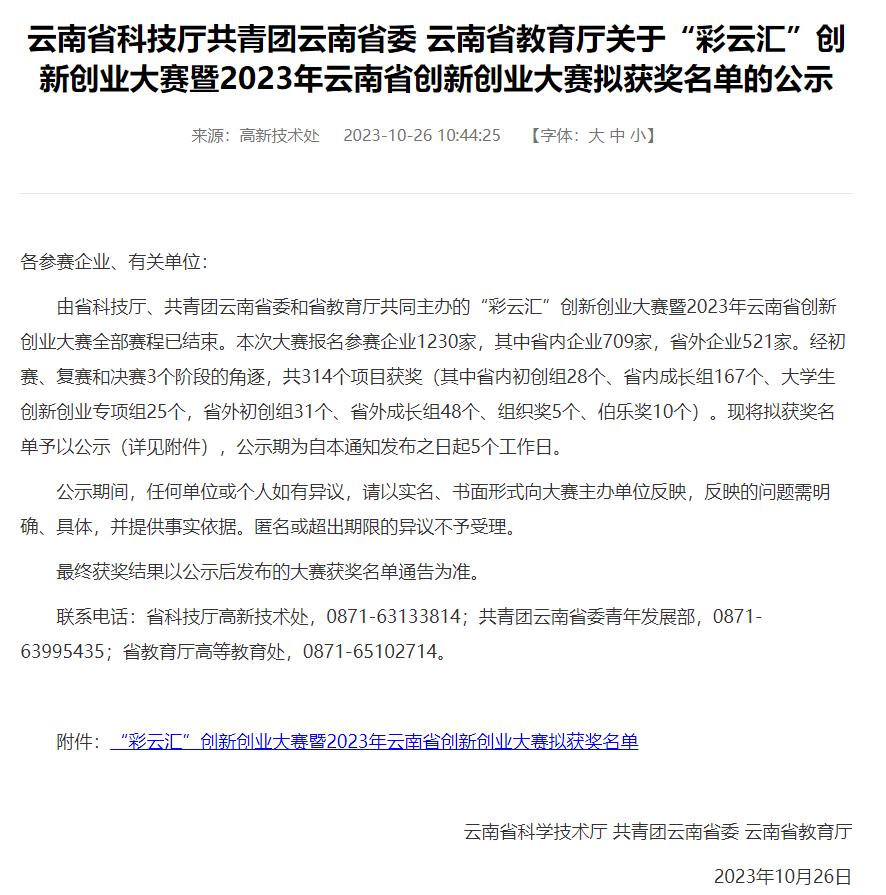 公司獲“彩云匯”創(chuàng)新創(chuàng)業(yè)大賽暨2023年云南省創(chuàng)新創(chuàng)業(yè)大賽三等獎