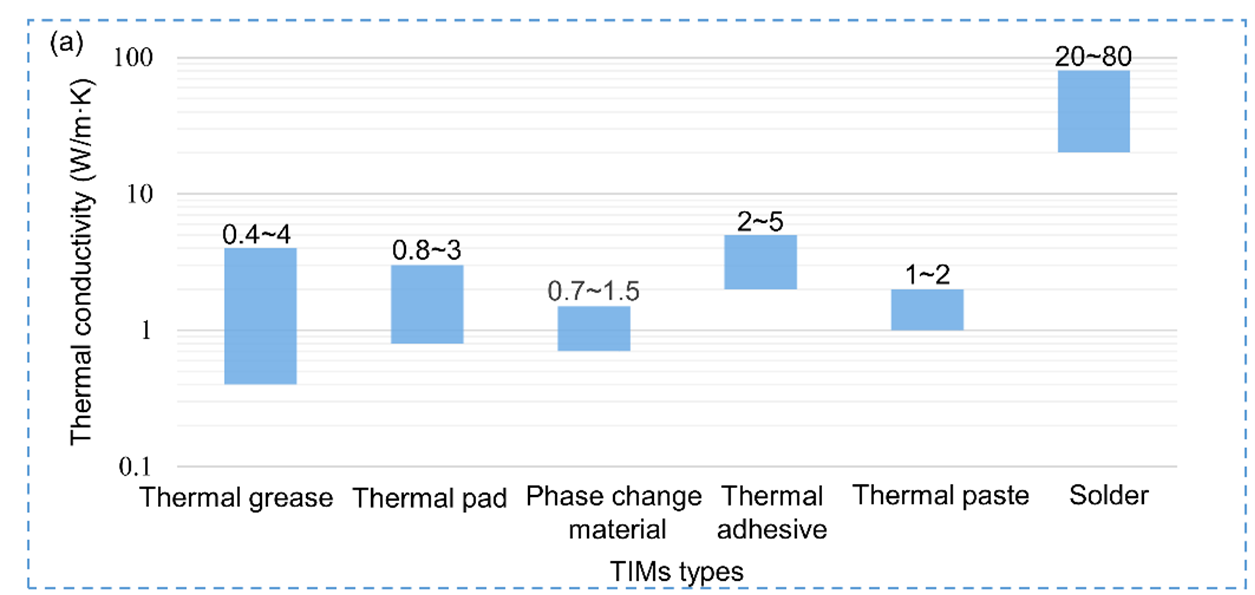 傳統(tǒng)的熱界面材料導(dǎo)熱系數(shù)范圍如圖3所示。導(dǎo)熱脂及其復(fù)合材料最為常用,具有較好的導(dǎo)熱性、較薄的接合層厚度、較低的粘附壓力,但容易出現(xiàn)泵出、干涸和相分離等現(xiàn)象。金屬焊料具有最高的導(dǎo)熱性,一般作為焊膏或預(yù)制箔使用,但在回流焊過程中存在氣泡、分層、高應(yīng)力和重復(fù)使用性差等問題。除焊料外,大多數(shù)熱界面材料由無(wú)機(jī)固體填料和聚合物組成。前者一般是高導(dǎo)熱顆粒,如金屬顆粒(銀和銅等)、陶瓷顆粒(氮化鋁和氮化硼等)和碳基材料(碳納米管和石墨烯等),其作用是提高導(dǎo)熱性和控制熱界面材料的流變特性;后者一般是導(dǎo)熱性較差的物質(zhì),如硅油、硅脂、硅膠等。傳統(tǒng)熱界面材料面臨的普遍問題是聚合物成分的熱導(dǎo)率太低,商用熱界面材料的熱導(dǎo)率最多只有5 W/(m·K)~8 W/(m·K)左右,逐漸不能滿足電子產(chǎn)品特別是高功率密度器件的散熱需要。
