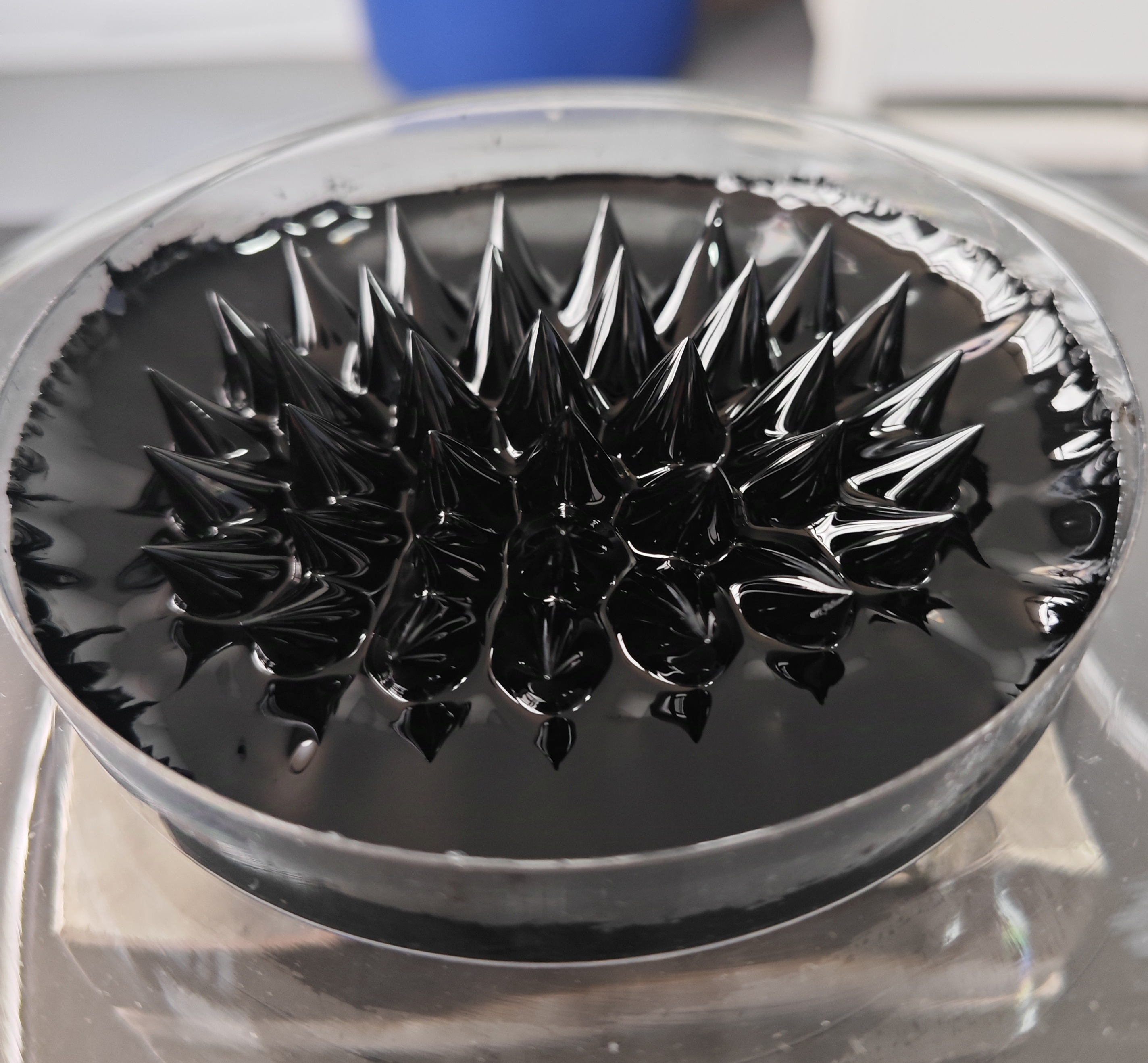 磁流體是一種新型的功能材料,它既具有液體的流動性又具有固體磁性材料的磁性。是由直徑為納米量級(10納米以下)的磁性固體顆粒、基載液(也叫媒體)以及界面活性劑三者混合而成的一種穩(wěn)定的膠狀液體。該流體在靜態(tài)時無磁性吸引力,當外加磁場作用時,才表現(xiàn)出磁性。